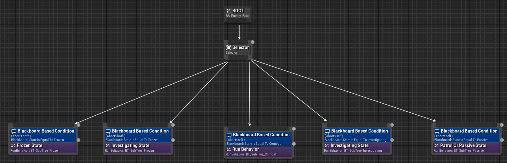 Behaviour Trees: The main place for all your behaviour and It is a perfect place to work in. I quickly started using “sub behaviour trees” By making some logic that is reused often in its own separate behaviour tree and then calling that logic from within other behaviour trees. This caused me to work a lot faster when creating new versions of enemies and helped with keeping the behaviour tree clean and readable. I also used Behaviour Tree “Tasks”, “Decorators” and “Services”. These let me have more control over my behaviour tree and tweak the behaviour more towards my wanted player experience.