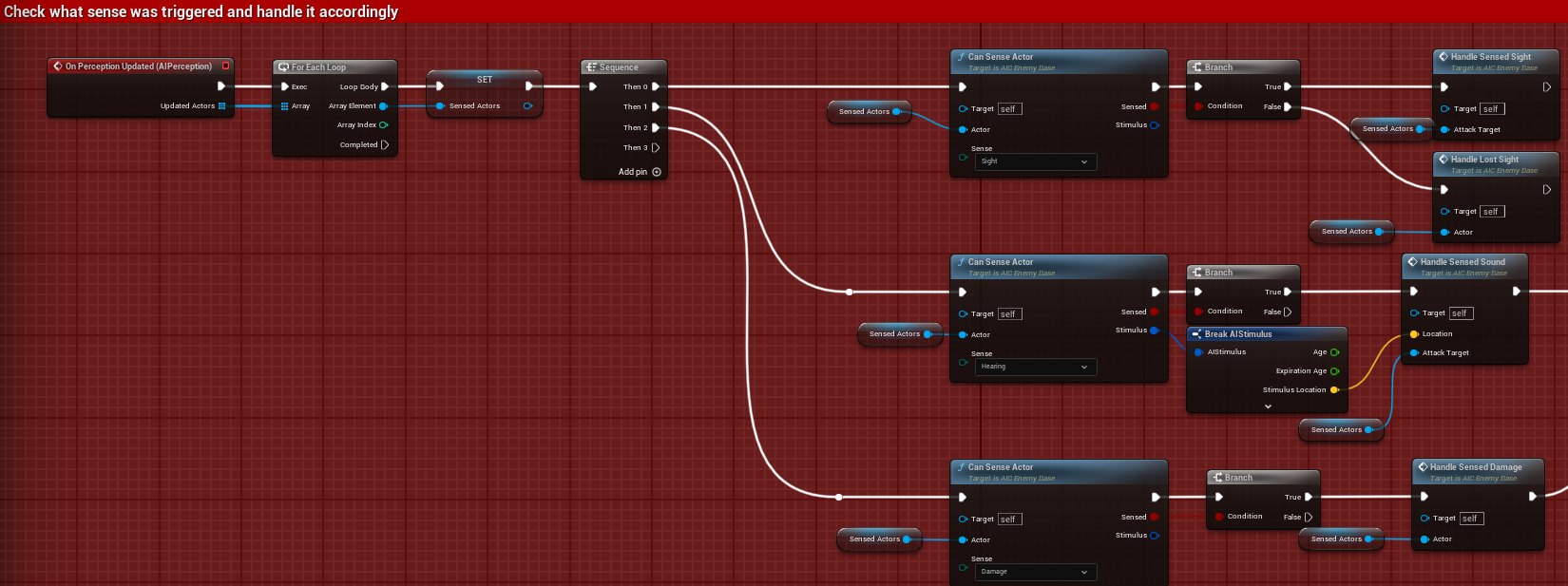 Spotting: Enemies have 2 ranges for their sight if the player is visible but only for a short time or too far away, the enemy will focus their focus on that direction, if triggered again they will attack, if not the enemy will either go investigate or go back to passive