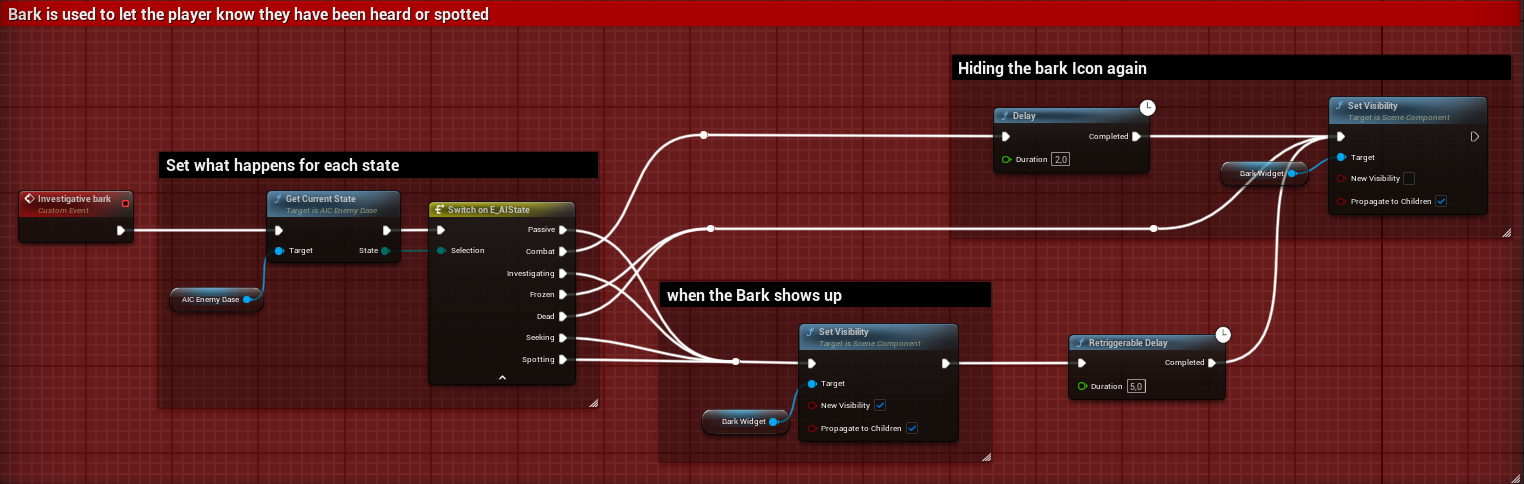 Patrolling: Enemies can be given a custom made patrol route. If an enemy is given a patrol route it’s default behaviour will become patrolling instead of standing guard. It simply walks back and forwards on a spline and can be given custom wait times at certain points to make them look out windows or give them a bit more liveliness.